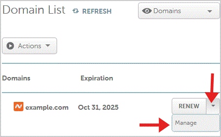 3. Under domain list, You can see list of your domains. In front of your domain click on . and select "Manage".