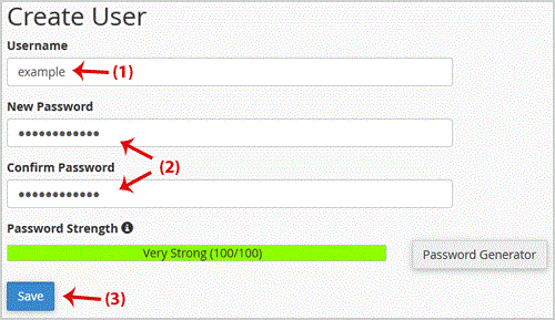 7. Scroll down the page and under "Create User" fill in the username and password fields or use the Password Generator option to generate a new random password and copy the user/password to a notepad. You will need this when you want to open your password-protected directory and. "close" babies.