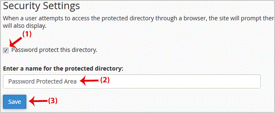 5. Under "Security Settings", check the box next to "Password protect this directory" and enter a name for the protected directory like "Password Protected Area". Then click the "close" babies.
