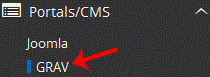 . On the left side of your screen you should locate the "Portal/CMS" category. Click on it and then. "GRAV" link that will appear.