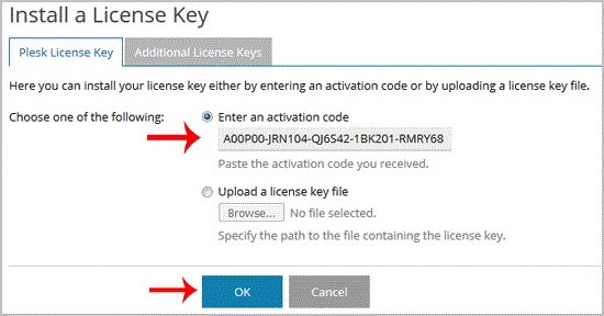 Step 7: Now click on "Install Key", enter your Plesk Activation code and press ok to close it. You can also use a trial key or use your own key.