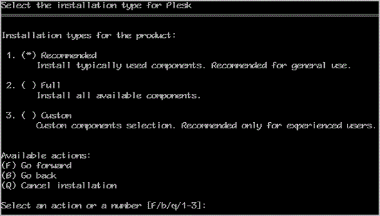 Step 3: In "Select the Installation type for Plesk" enter "F" or, in case you are familiar with what you are doing, chose the other option - installing all components by entering "2" (without the quotes) and press "F'.